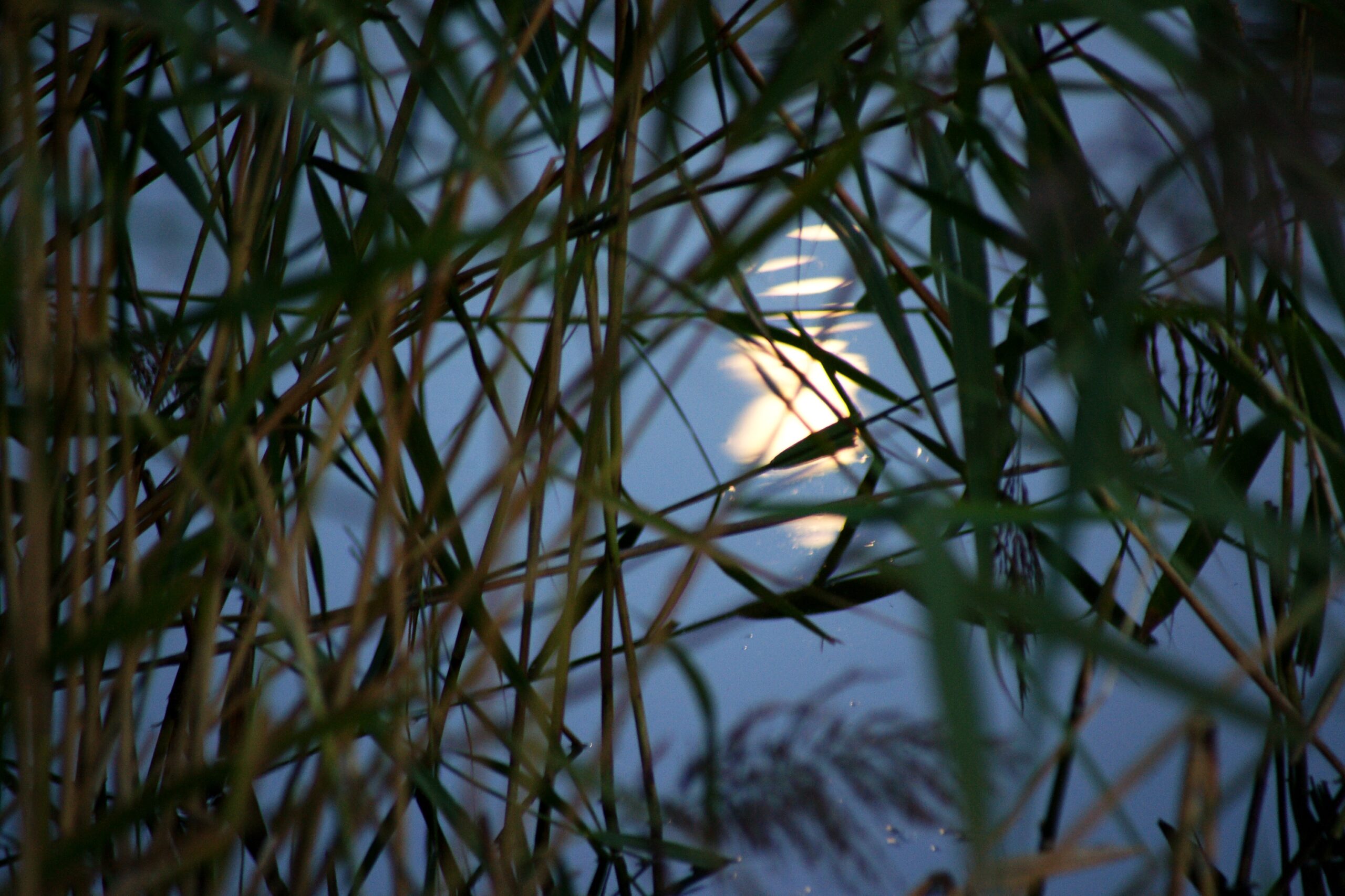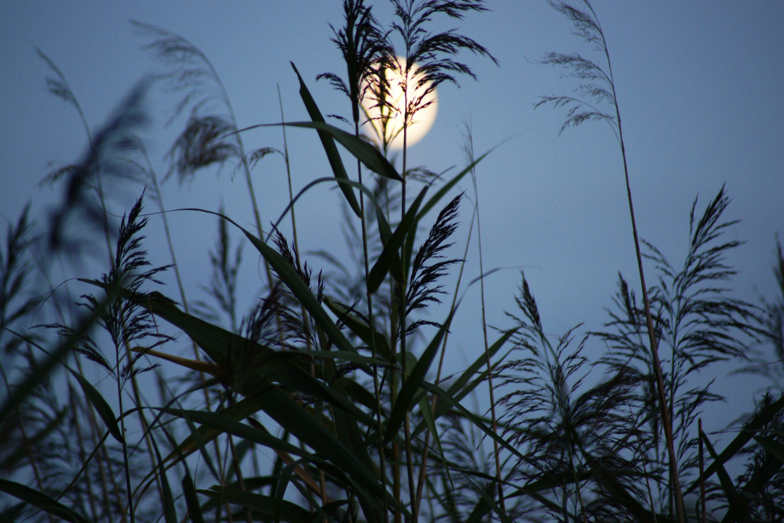 Porastające brzegi stawu wysokie trawy ciemniały, niebo granatowiało. Na nim, srebrno-złotawą barwą coraz mocniej rozświetlał się Księżyc.
