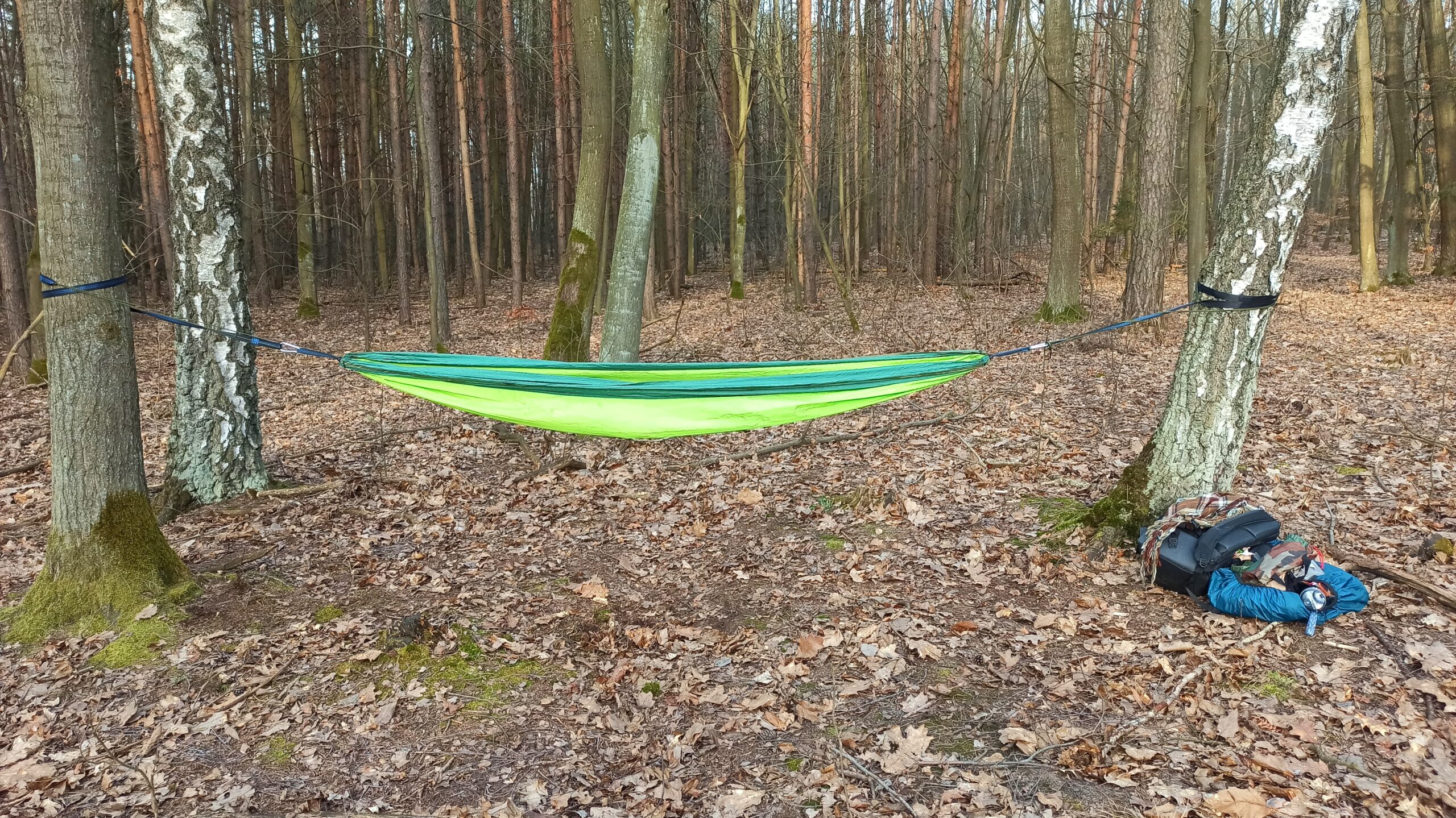 Hamak kupiłam już dość dawno, był tani, w dodatku z przeceny, więc wzięłam, mając w planach, że wykorzystam go kiedyś na działce. Ponieważ zafascynowałam się bushcraftem, postanowiłam przetestować go w lesie, bo jeszcze nie wiem, jaki sposób nocowania wybrać. Kilka dni wcześniej mierzyłam się z tarpem, to także był mój pierwszy raz, a teraz z hamakiem.