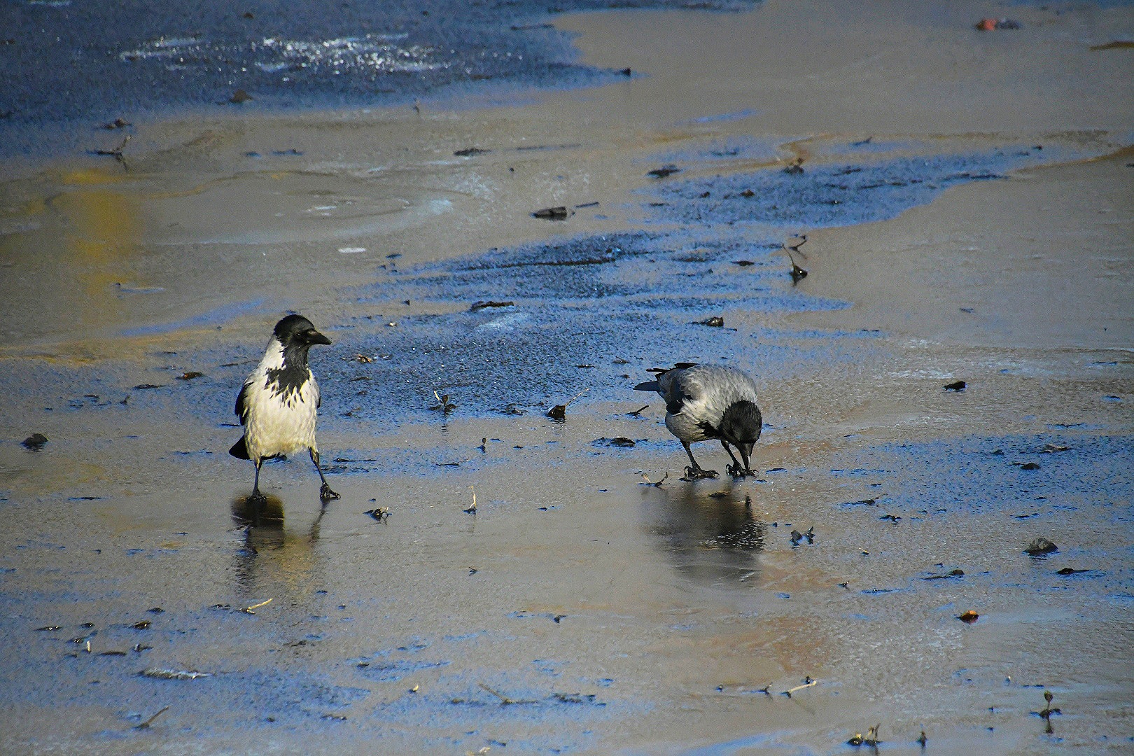 Gdy im się tak przyglądałam, jak chodzą to tu to tam po zamarzniętych kałużach wody, a potem pochylają się z zaciekawieniem nad szklaną taflą, by za chwilę rozkuć ją dziobem, to zastanawiałam się, czy widzą w niej swoje odbicie, które ja przecież wyraźnie dostrzegałam.