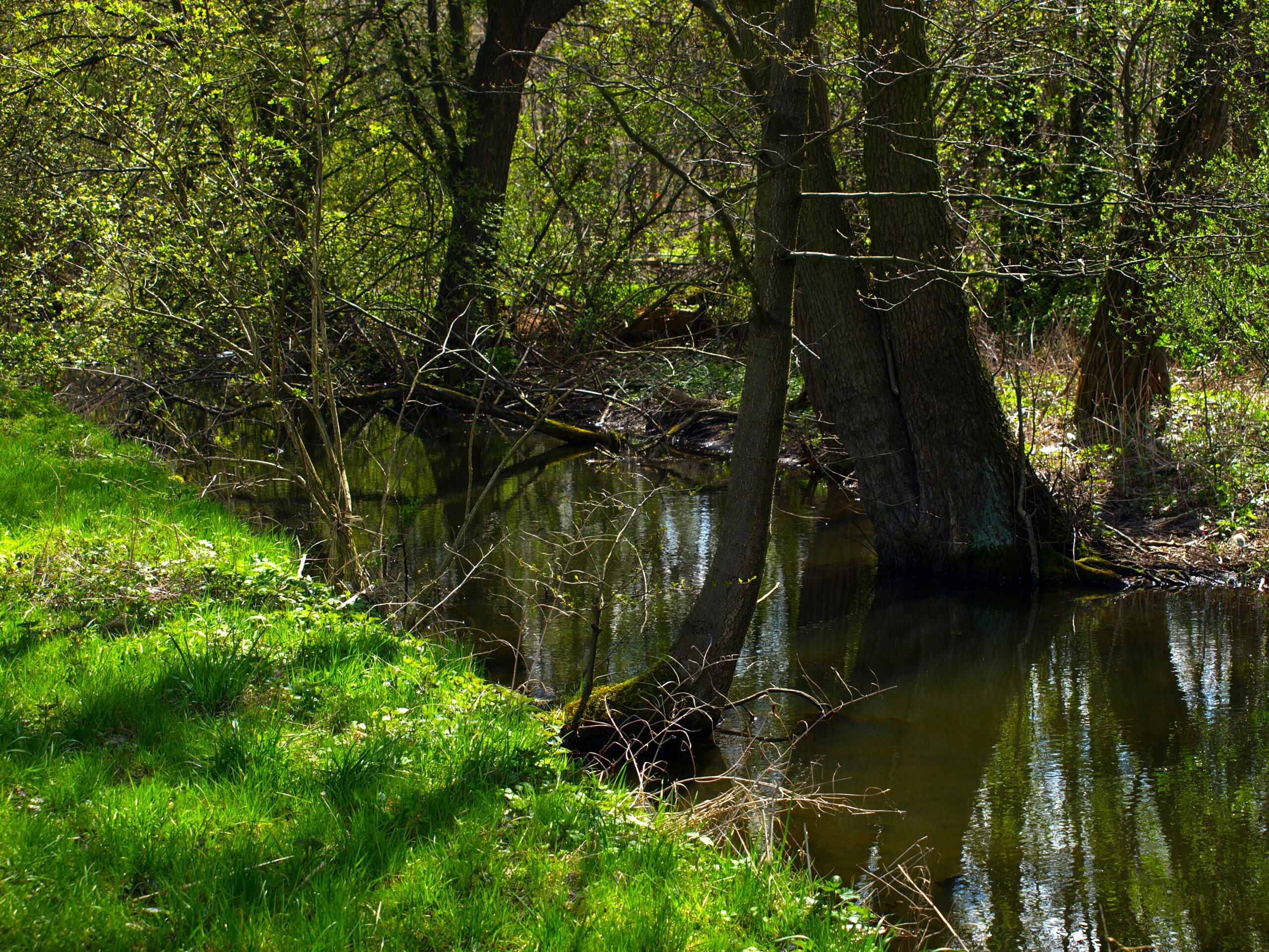 Lubię połączenie drzew i zbiorników wodnych: stawów, rzeczek, rozlewisk, mokradeł. Owszem, zwykle trudniej się w takim terenie wędruje i bardziej trzeba uważać, co się ma pod nogami, ale wynagradza to malowniczość takich miejsc.