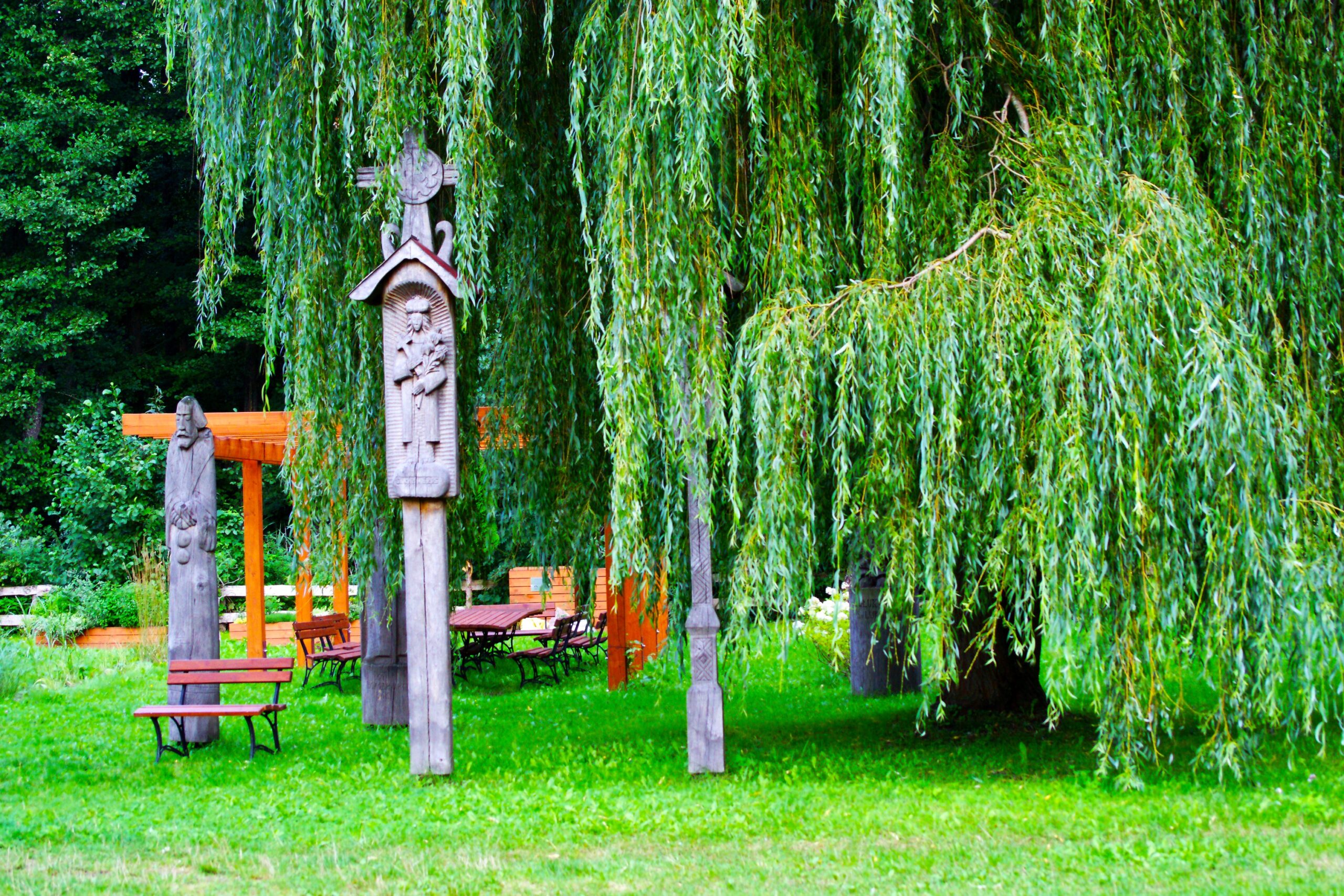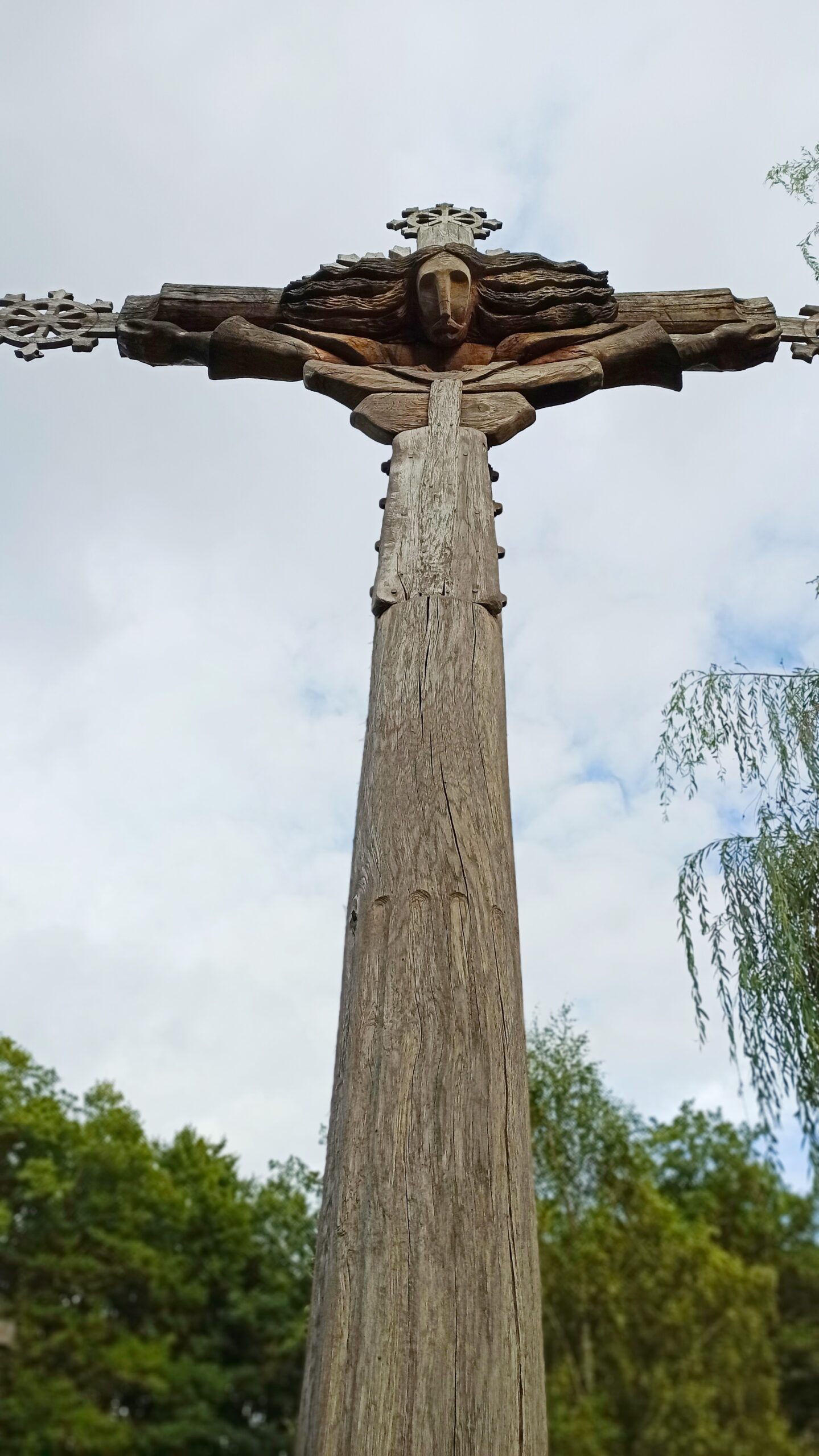 Po nasyceniu się widokiem jeziora udałam się na spacer do przyklasztornego ogrodu, w którym w oczy od razu rzucają się duże rzeźby z drewna. Obok postaci mnichów nie można było przejść obojętnie, ale niewątpliwie szczególną uwagę zwracał krzyż z wiszącym na nim Chrystusem.