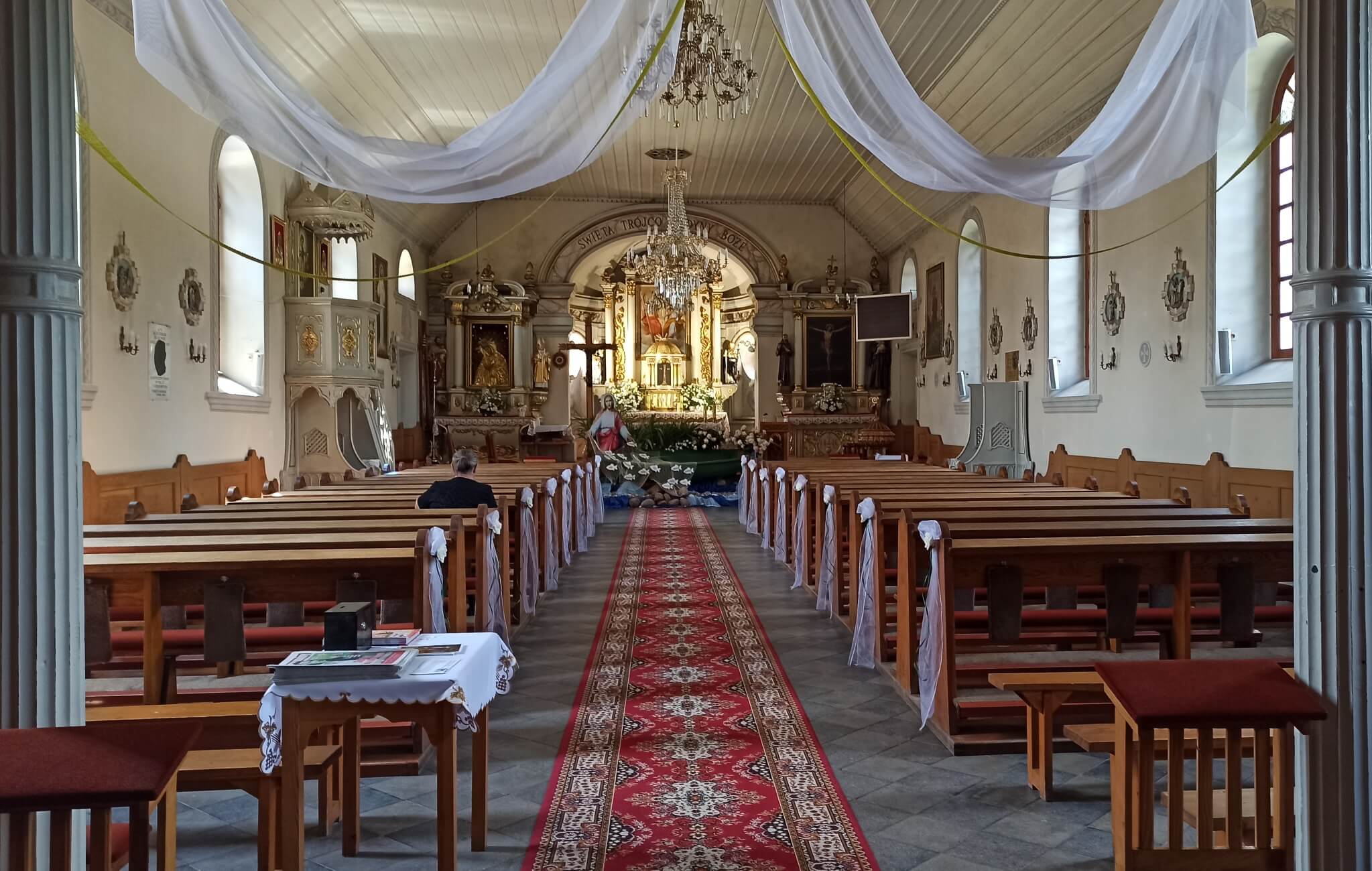 Po moje rozmowie z panią Teresą poszłam już na obiad, po drodze mijając zlokalizowane przy ul. 3 Maja także zabytkowe Domy Tkaczy, a przed samym wyruszeniem do puszczy weszłam też na krótką modlitwę do również zabytkowego (z XVIII wieku) kościoła katolickiego pw. Świętej Trójcy.