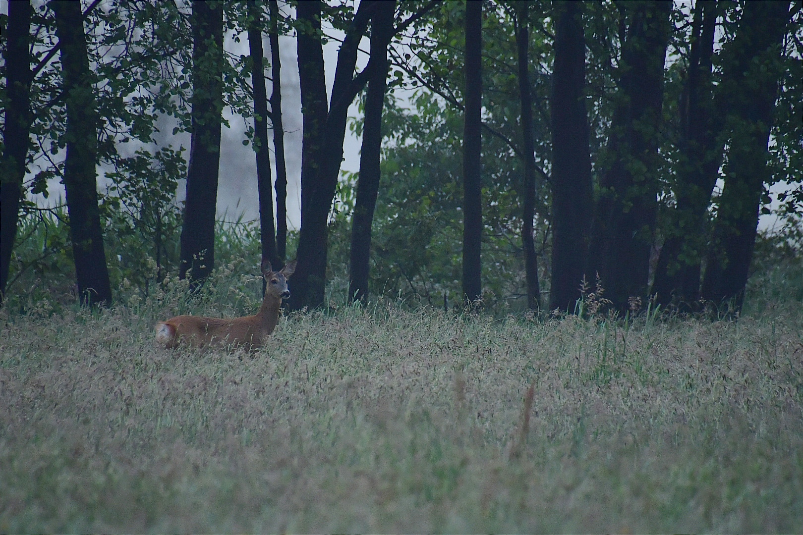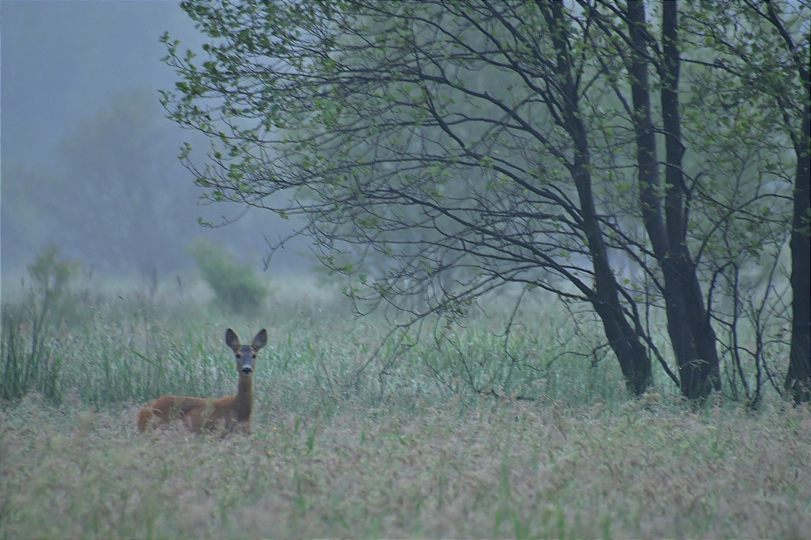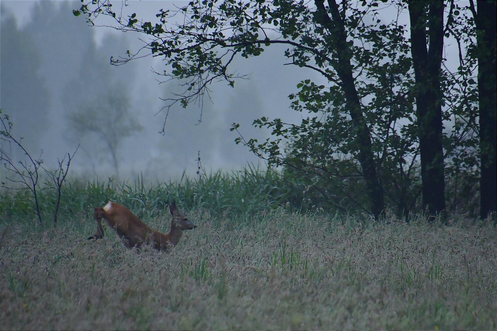 Pierwsza pojawiła się sarna. Wychynęła z zamglonego lasu niczym duch. Dostrzegła mnie od razu. Stanęła. Ja także. Po chwili w łąkowej oddali pojawił się żuraw. Ledwie widoczny we mgle wydawał się efemerydą, wytworem mojej wyobraźni. Nie zwracał na mnie uwagi. Stąpał powoli, by po chwili zatrzymać się i patrzeć, jakoś tak tęsknie, w dal.
